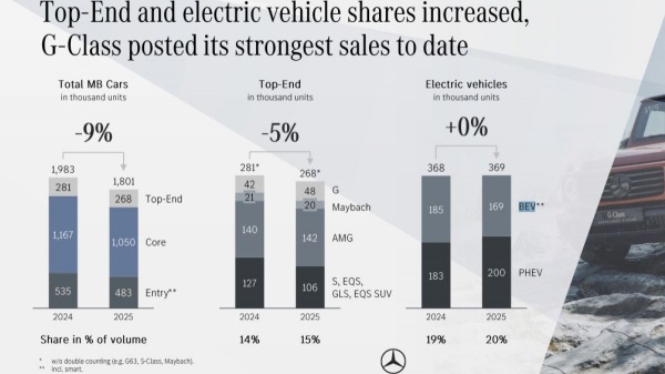 Секрет такого антиуспеха известен: по компании больно бьет не вписывающаяся в реалии рынка электроповестка. Хотя Mercedes‑Benz и зафиксировал рост продаж электрифицированных авто (369 тысяч против 368 тысяч годом ранее), весь прирост пришелся на подзаряжаемые гибриды (со 183 тысяч до 200 тысяч), а реализация чистых электромобилей, наоборот, сократилась (со 185 тысяч до 169 тысяч). Они же подпортили статистику линейке моделей сегмента Top‑End: из‑за провала электроседана EQS и электрокроссовера EQS SUV продажи статусных машин марки сократились с 281 000 в 2024 году до 268 000 в 2025‑м.