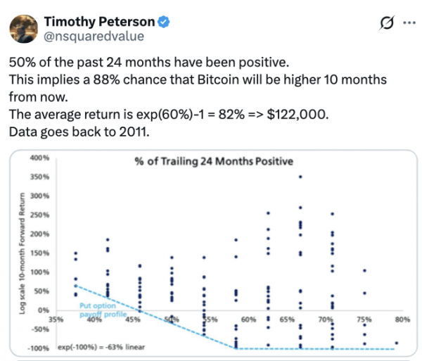 “50% последних 24 месяцев были положительными. Это подразумевает 88% вероятность того, что Биткоин будет выше через 10 месяцев”, – сказал экономист Тимоти Петерсон в субботнем посте. По данным CoinGlass, в 2025 году биткоин продемонстрировал рост в январе, апреле, мае, июне, июле и сентябре, в то время как остальные шесть месяцев завершились снижением.