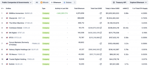 Согласно данным CoinGecko, Bitmine является крупнейшей казначейской компанией Ethereum с большим отрывом: SharpLink владеет около 868 699 ETH, а The Ether Machine — 496 712 ETH.