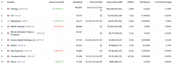 Казначейская активность Биткоин за последние 30 дней показывает расхождение между накоплением и продажей. Стратегия привела к покупкам с большим отрывом, добавив 42 166 BTC, в то время как японская Metaplanet увеличила свои активы на 5 075 BTC. Меньшие поступления поступили от таких компаний, как Strive, которые добавили 430 BTC.
