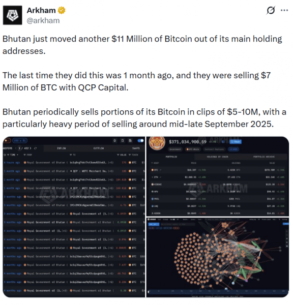 «Бутан периодически продает часть своих Биткоин порциями на сумму 5–10 миллионов долларов, причем особенно тяжелый период продаж приходится на середину-конец сентября 2025 года», — сказал Аркхэм.