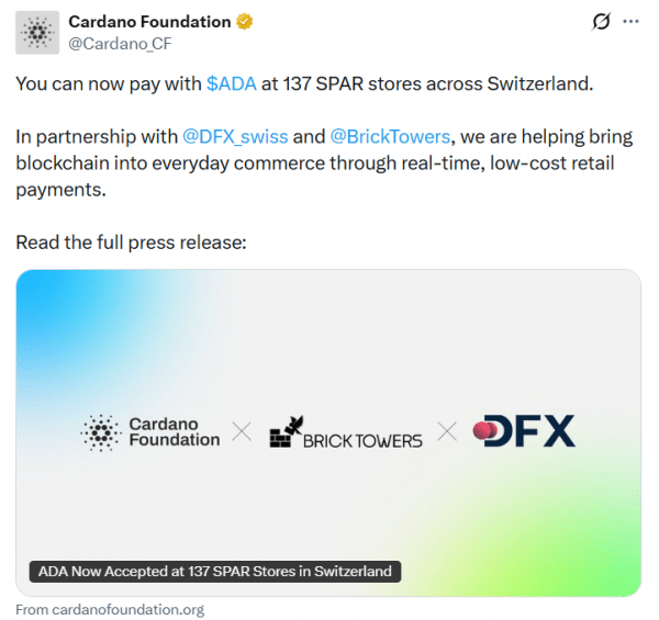 Пользователи Cardano (ADA) могут начать оплачивать свои продукты в 137 супермаркетах Spar по всей Швейцарии после последней интеграции Open Crypto Pay от швейцарской финтех-компании DFX.swiss, сообщил в четверг Cardano Foundation.