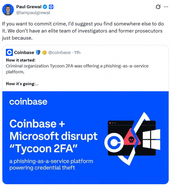 Финансовое отслеживание также было ключевым аспектом. Coinbase заявила, что помогла отследить связанные с блокчейном транзакции, финансирующие Tycoon 2FA, что помогло идентифицировать предполагаемого администратора и покупателей фишинговой платформы.