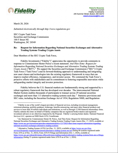 В Fidelity заявили, что для SEC «крайне важно» разработать комплексную нормативную базу и четкие правила торговли токенизированными ценными бумагами, включая правила торговли токенизированными ценными бумагами, выпущенными третьими сторонами.