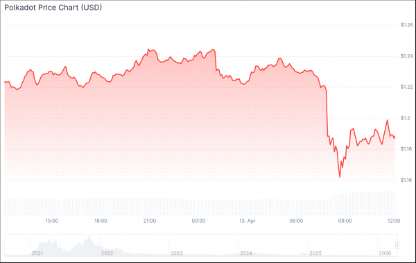 По данным CoinGecko, собственный токен DOT ненадолго упал до дневного минимума в 1,16 доллара в понедельник, а затем восстановился до уровня выше 1,19 доллара на момент написания статьи.