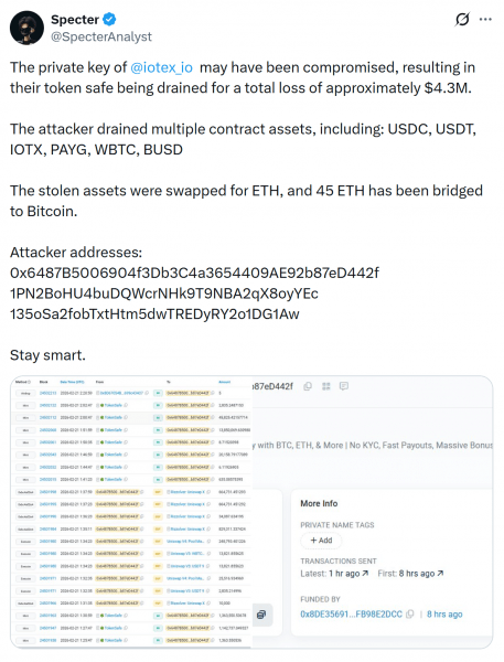 Взлом кошелька IoTeX привел к убыткам в размере 4,3 миллиона долларов. Источник: Призрак