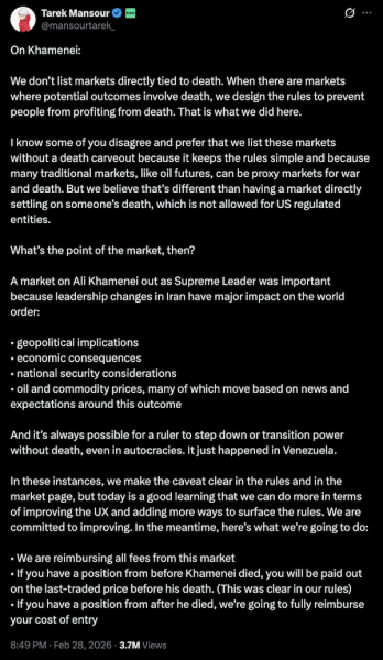 Мансур утверждал, что Калши просто придерживался своей политики не допускать «рынков смерти», и сказал, что эта политика четко прописана в правилах рынка.