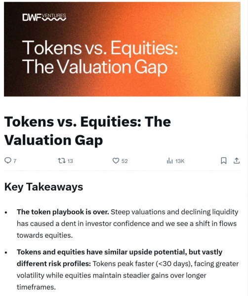 В своем отчете DWF сравнил листинговые компании, такие как Circle, Gemini, eToro, Bullish и Fig, с токенизированными проектами, использующими скользящие 12-месячные отношения цены к продажам. Публичные акции торговались с кратностью продаж примерно в 7–40 раз по сравнению с 2–16 раза для сопоставимых токенов.