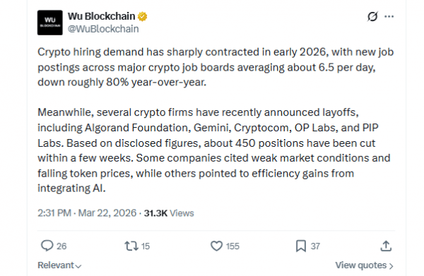 Сектор криптовалюты пострадал от волны увольнений в 2026 году, когда несколько фирм заявили о новом акценте на ИИ.