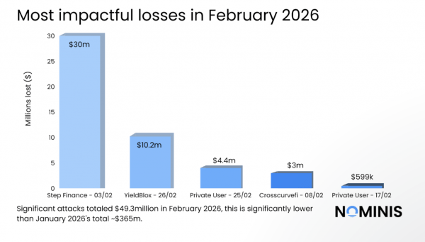 Самые значительные потери от мошенничества и взломов криптовалют в феврале 2026 года. Источник: Nominis