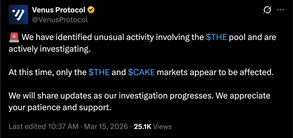 Согласно сообщению Venus Protocol, необычная торговая активность затронула только пулы токена Cake (CAKE), собственной криптовалюты децентрализованной биржи PancakeSwap, и токена Thena. Команда Венеры сказала: