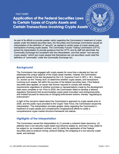 Руководство SEC, опубликованное во вторник, установило таксономию цифровых активов, разделив их на пять категорий, включая цифровые товары, цифровые предметы коллекционирования, такие как невзаимозаменяемые токены (NFT), цифровые инструменты, стейблкоины и токенизированные ценные бумаги.