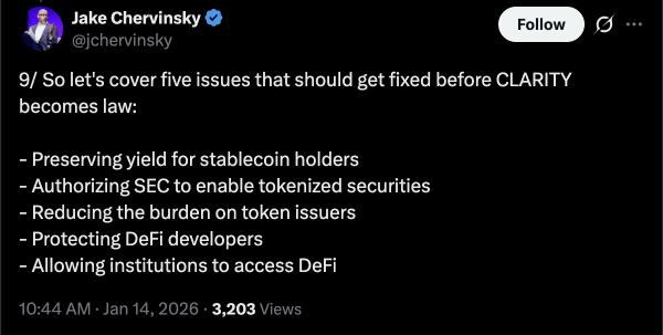 Закон CLARITY застопорился в январе 2025 года после того, как криптовалютная биржа Coinbase и другие игроки отрасли выразили обеспокоенность по поводу запрета на доход от стейблкоинов и отсутствия защиты для разработчиков программного обеспечения с открытым исходным кодом.