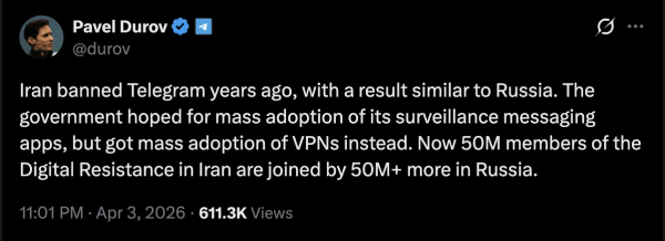 “Правительство надеялось на массовое внедрение своих приложений для обмена сообщениями, но вместо этого получило массовое внедрение VPN. Теперь к 50 миллионам членов цифрового сопротивления в Иране присоединились еще более 50 миллионов в России”.