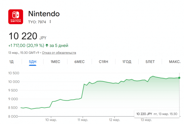 За последние пять дней акции «Большой N» подскочили на 20% и достигли стоимости в 10220 иен за штуку. При том, что еще в феврале их стоимость падала до многолетнего минимума в 8350 иен. Как сообщает Bloomberg, общая стоимость ценных бумаг компании с момента релиза Pokemon Pokopia прибавила внушительные 14 миллиардов долларов.