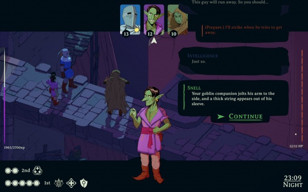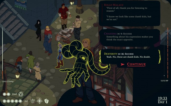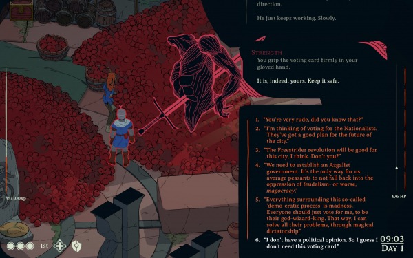 Здесь у нас всего шесть D&D-характеристик: сила, ловкость, телосложение, мудрость, интеллект и харизма. И в роли персонажей они настолько гипертрофированы, однобоки и предсказуемы! Сила вот, видите ли, грубая, любит вступать в драки и топит за националистов. А ловкость избегает открытых столкновений, больше всего любит деньги и болеет за свободный рыночек, который всех порешает. Вау. Ну слишком уж часто тут заранее приходится угадывать, что твоим «внутренним голосам» есть сказать по тому или иному поводу. И их диалоги очень быстро приедаются.