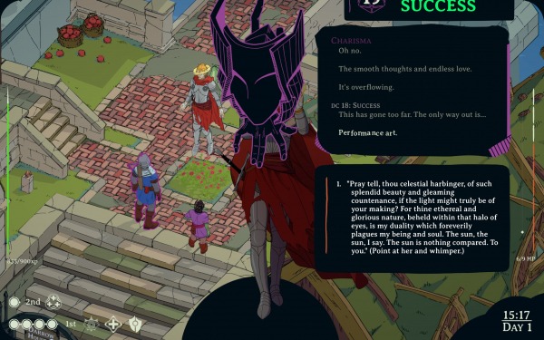 Хотя у нее есть совершенно неопровержимые — причем собственные! — достоинства. Прежде всего, это реально очень большая и наполненная контентом RPG. По меркам сольных разработок — вообще, кажется, беспрецедентный случай. Только на первое слепое прохождение без манчкизма может уйти часов 20-25, при том что потенциал к реиграбельности тут очень недурственный. От объема диалогов и сайд-квестов может закружиться голова — и это не какая-то штамповка в духе игр-песочниц. За многими сторонними поручениями стоят увлекательные мини-истории и яркие персонажи. Где еще дадут возможность пофлиртовать с бессмертным Сфинксом? Или попробовать выдвинуть самого себя в тираны-волшебники? Да и основной квест интригует!