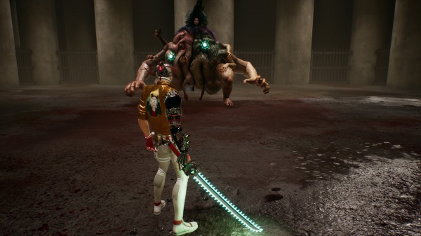 Прикольный главный герой со своей огромной ретро-футуристичной башкой, золотой курткой с ожившей нашивкой (в ней сидит его дед!) и появляющимся из воздуха мечом бегает по абсолютно безликим локациям и крошит абсолютно безликих зомби. Уникальные враги тоже кажутся до боли скучными уродами, а добивает все град цветастых спецэффектов, за которыми иногда не видно происходящего. Кажется, что сейчас такое может сделать за миску риса один несчастный китаец, которого обучили основам визуального программирования.