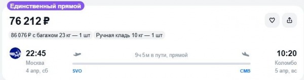 Например, места эконом на лайнере нацперевозчика, отправляющемся из Москвы в Коломбо 4 апреля, стоят 76,2 тыс. руб., а с багажом – 86 тыс. руб. за прямой перелет в одну сторону (Здесь и далее указаны наличие и цены, актуальные по состоянию на 14:30 21 марта. – Ред.).