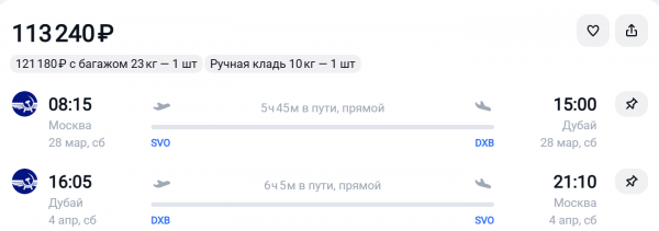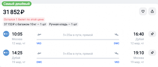 Если отправиться в Дубай из Москвы 12 марта, а вернуться 26-го, перелет обойдется значительно дешевле. Например, у авиакомпании «Победа» можно найти билеты от 31 тыс. руб. Вариант с багажом на те же даты стоит 37 тыс. Вылет из Внуково удобный – в 10:05, обратно – в 14:25.