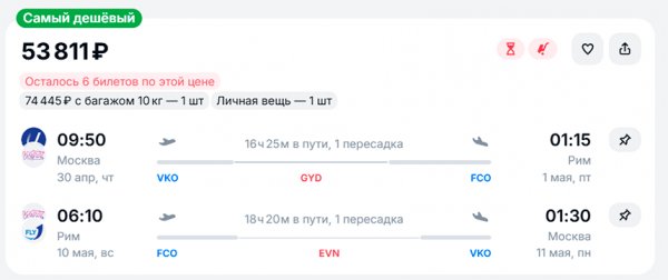 Самый бюджетный перелет из Москвы в Рим на те же даты обойдется в 53,8 тыс. руб., правда удобным его не назовешь.