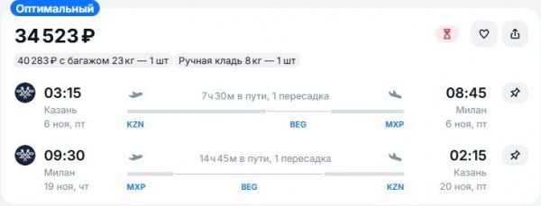 Есть вариант и подешевле: за 31,1 тыс. руб. или 36,9 тыс. с учетом перевозки чемодана. Но в этом случае стыковка на маршруте в Милан будет продолжительной – 12,5 часа.