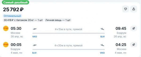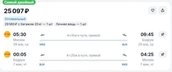 29 апреля она доставит прямым рейсом в Бодрум, обратно – 7 мая, за 25 тыс. руб., с багажом – за 29,5 тыс. (Здесь и далее указаны наличие и цены, актуальные по состоянию на 20:00 12 апреля. – Ред.)