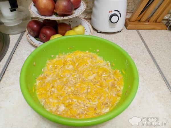 Берем тыкву, очищаем, натираем на крупной терке. Берем два крупных яблочка, также трем на терке. Добавляем яйцо, разрыхлитель теста, всыпаем полстакана овсяных хлопьев. Даем постоять, чтобы хлопья овсяные стали мягкие и набухли. Теперь на смазанную сковороду, выливаем тесто. Ставим в духовку на 200 градусов. Сначала на нижний режим, затем на верхний. Запекаем до красивой румяной корочки. Печем примерно минут тридцать. Достаем, даем отдохнуть и можно пробовать. Приятного аппетита!