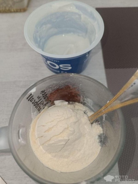 Затем накладываю туда 100 грамм греческого йогурта (обычно в банках TEOS 250 грамм — так что, чуть меньше половины).