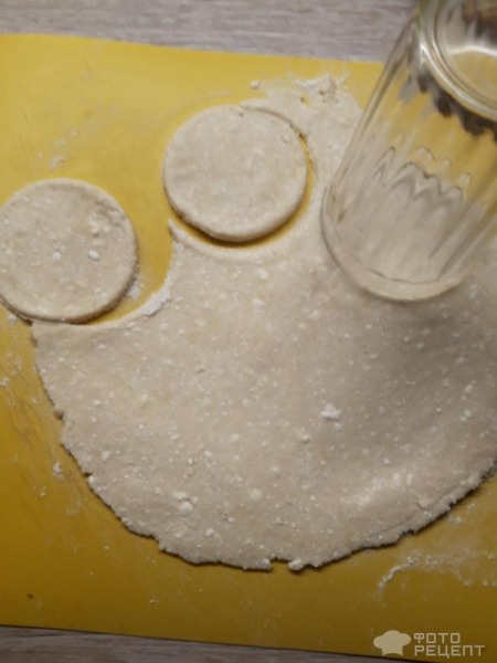 4. Ободком стакана делаю из теста такие кружочки, можно их делать крупнее и мельче, кто как любит. Просто посуду для кружочков брать горлышком других диаметров.