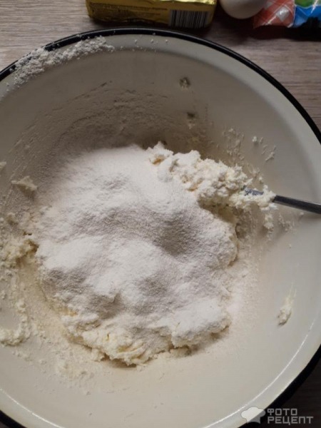 2. Насыпаю к ним муку и продолжаю перемешивать вилкой. Когда уже видно, что получается однородная масса похожая на цельное тесто, начинаю перемешивать руками, досыпаю муки до тех пор, пока тесто не станет прилипать к рукам. При желании можно чуть чуть добавить ванилина.