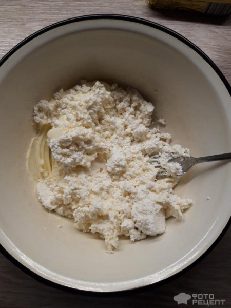 1. В емкости перемешиваем сливочное масло и творог. Беру в пропорции 1:1, чтобы легче перемешивалось, масло достаю заранее из холодильника, чтобы оно размягчилось.