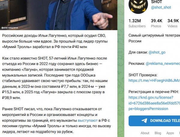 По информации телеграм-канала Shot, несмотря на свою неоднозначную позицию — Илья Лагутенко продолжает зарабатывать в России. По данным указанного издания, доход музыканта в России продолжает расти. Например, за 2025 год компания Лагутенко «Лагуна», занимающаяся продажей музыкальных записей, заработала 38,9 миллионов рублей. И такое положение дел заметным образом беспокоит общественность.